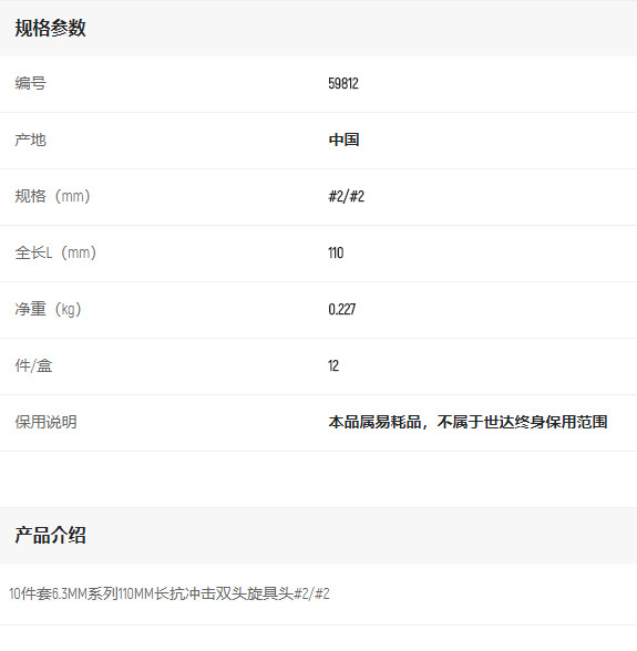 產(chǎn)品名字:世達10件套6.3MM系列110MM長抗沖擊雙頭旋具頭#2/#2